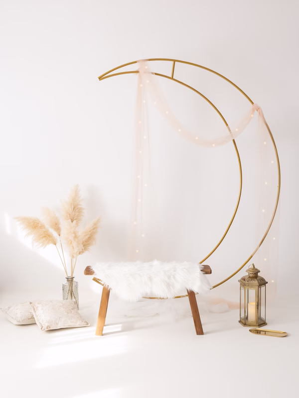 Simbolika polmeseca: Osrednji element je velik zlat polmesec, okrašen z nežnim tilom in lučkami, ki pričarajo občutek čarobnosti.